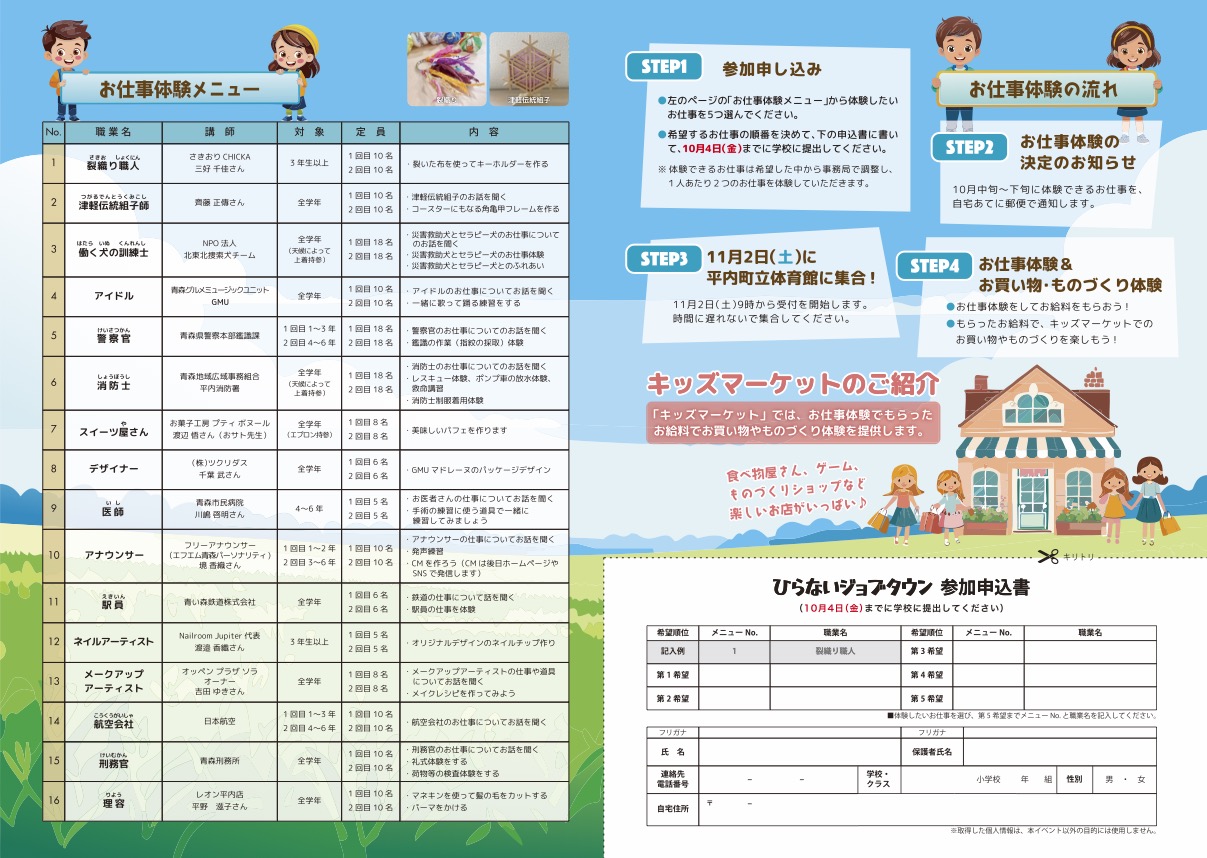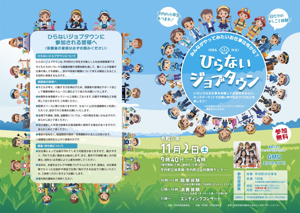 〜子ども達の未来を地域で育もう〜という思いで小学生職業体験事業「ひらないジョブタウン」に取り組んで6年目、今年は11月2日(土)に開催します。